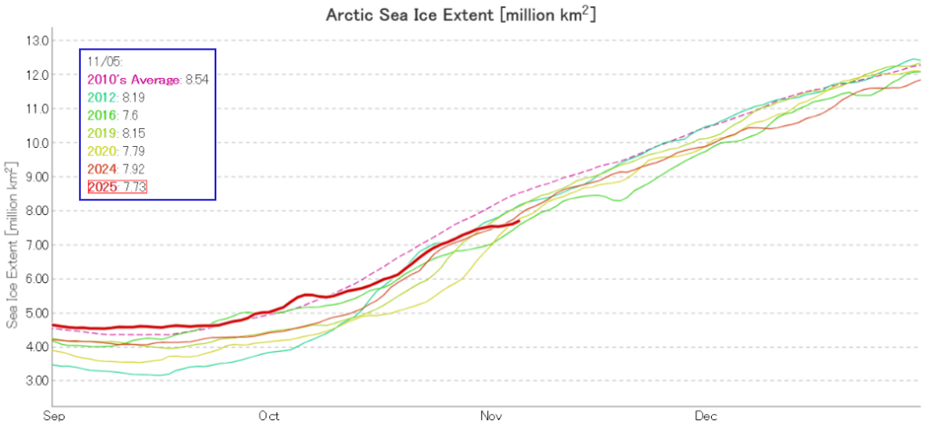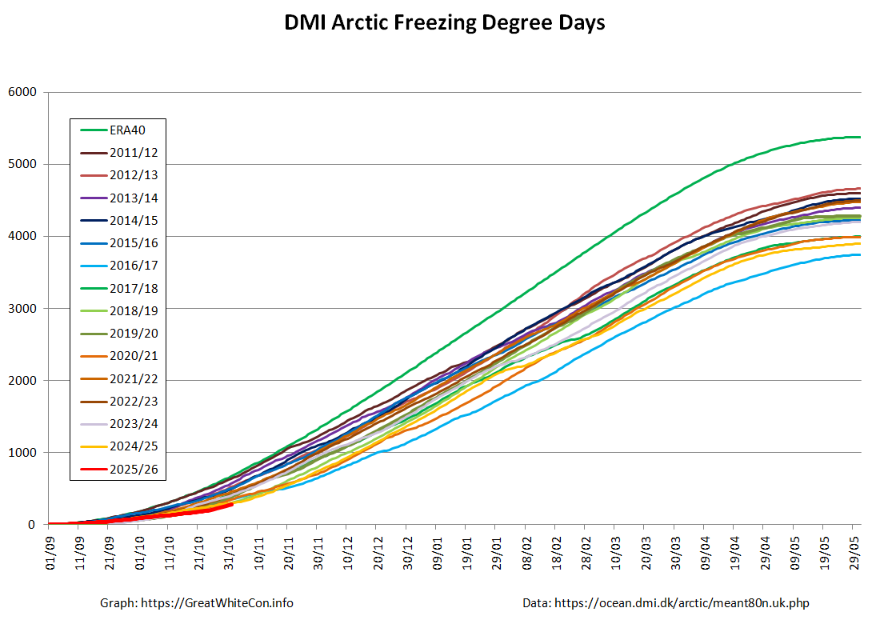 High Arctic freezing degree days based on DMI >80N data were lowest for the date at the beginning of November: