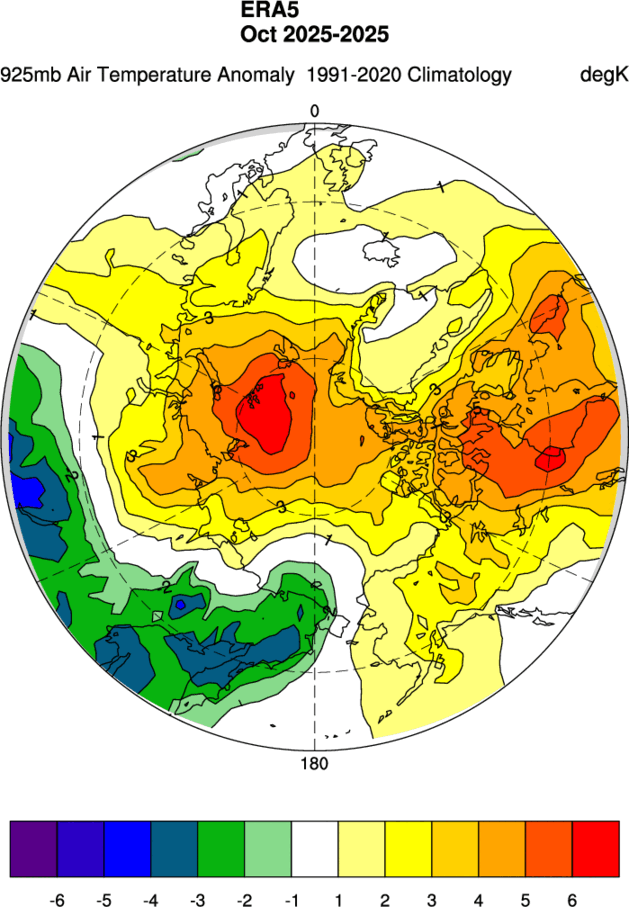 The ERA5 MSLP map for October shows high pressure over Siberia, associated with lower than normal air temperatures at 925 hPa across the region. However, temperatures across almost the entire Arctic Ocean were above normal: