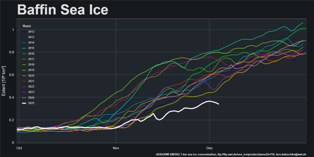 However, sea ice extent in the Barents Sea and Baffin Bay is currently lowest for the date in the AMSR2 record: