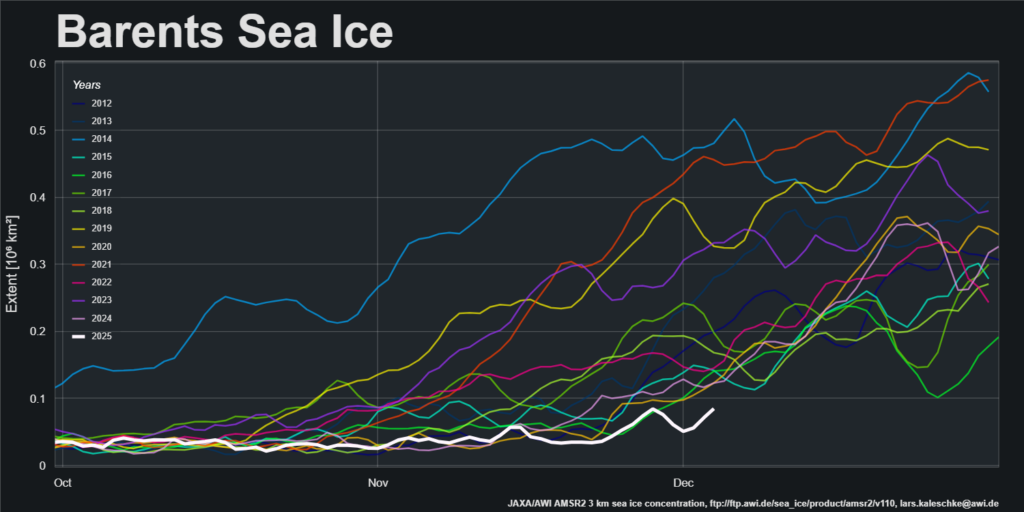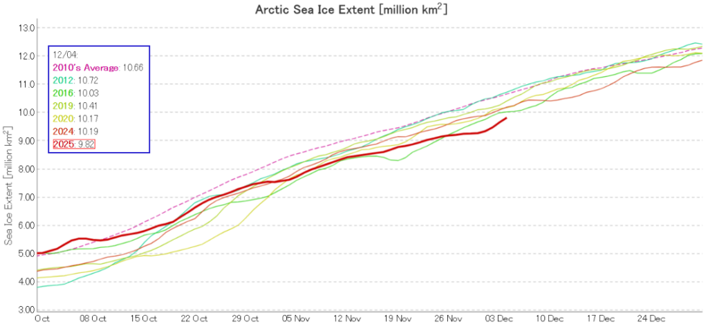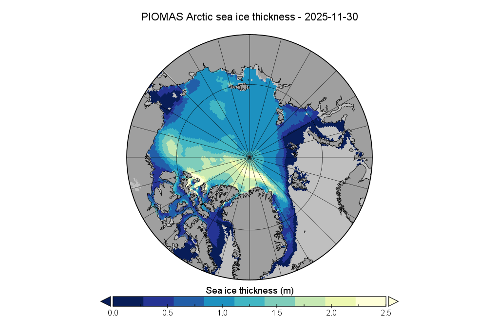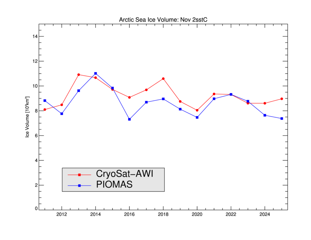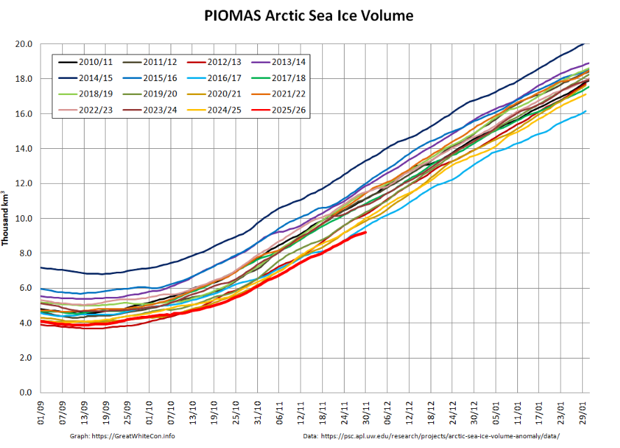 Looking at sea ice volume next, at the end of November PIOMAS volume was 9.20 thousand km³, lowest for the date (in the satellite era).